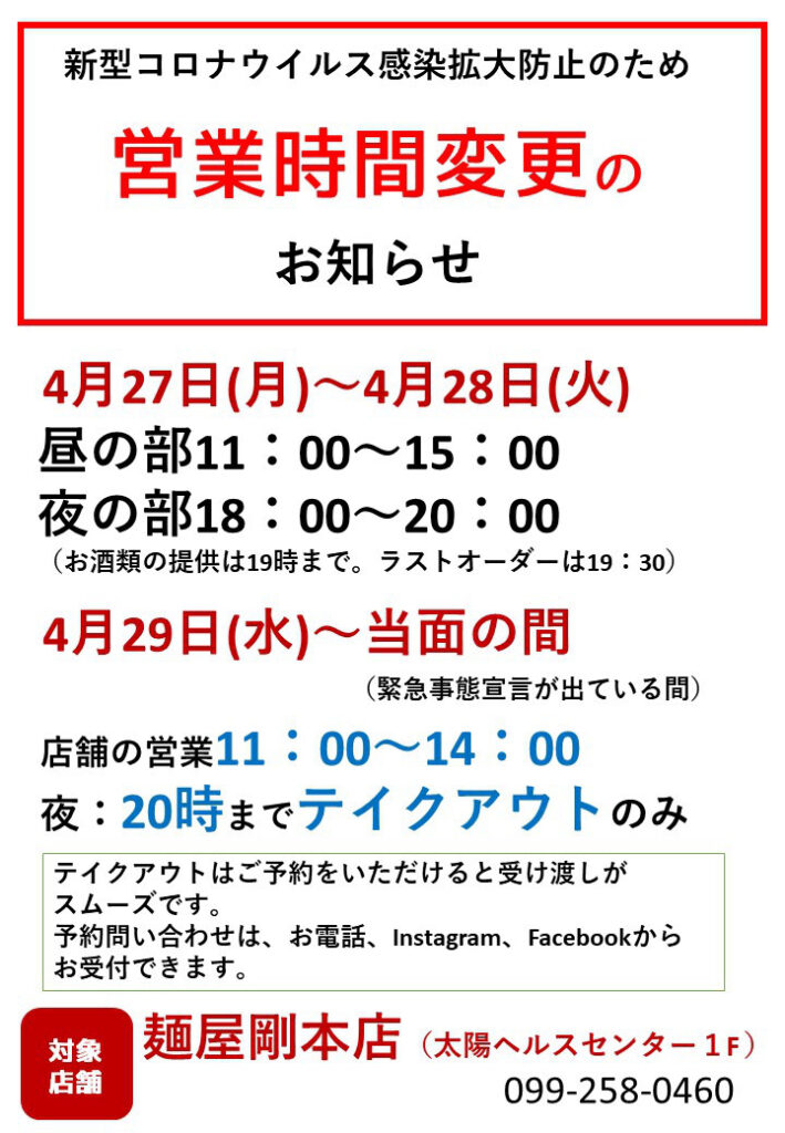 新型コロナウイルス感染拡大防止のため営業時間変更のお知らせ