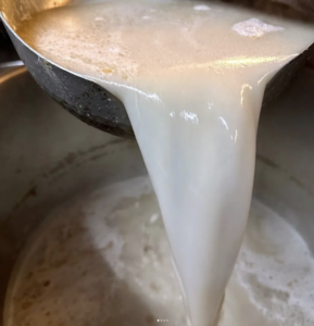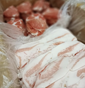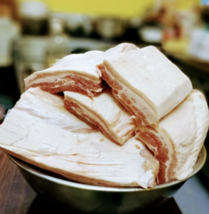 豚バラブロックを袋に閉じ込めて鹿児島県産の2種類の特製の醤油タレを加えて沸騰した寸胴で加熱。
